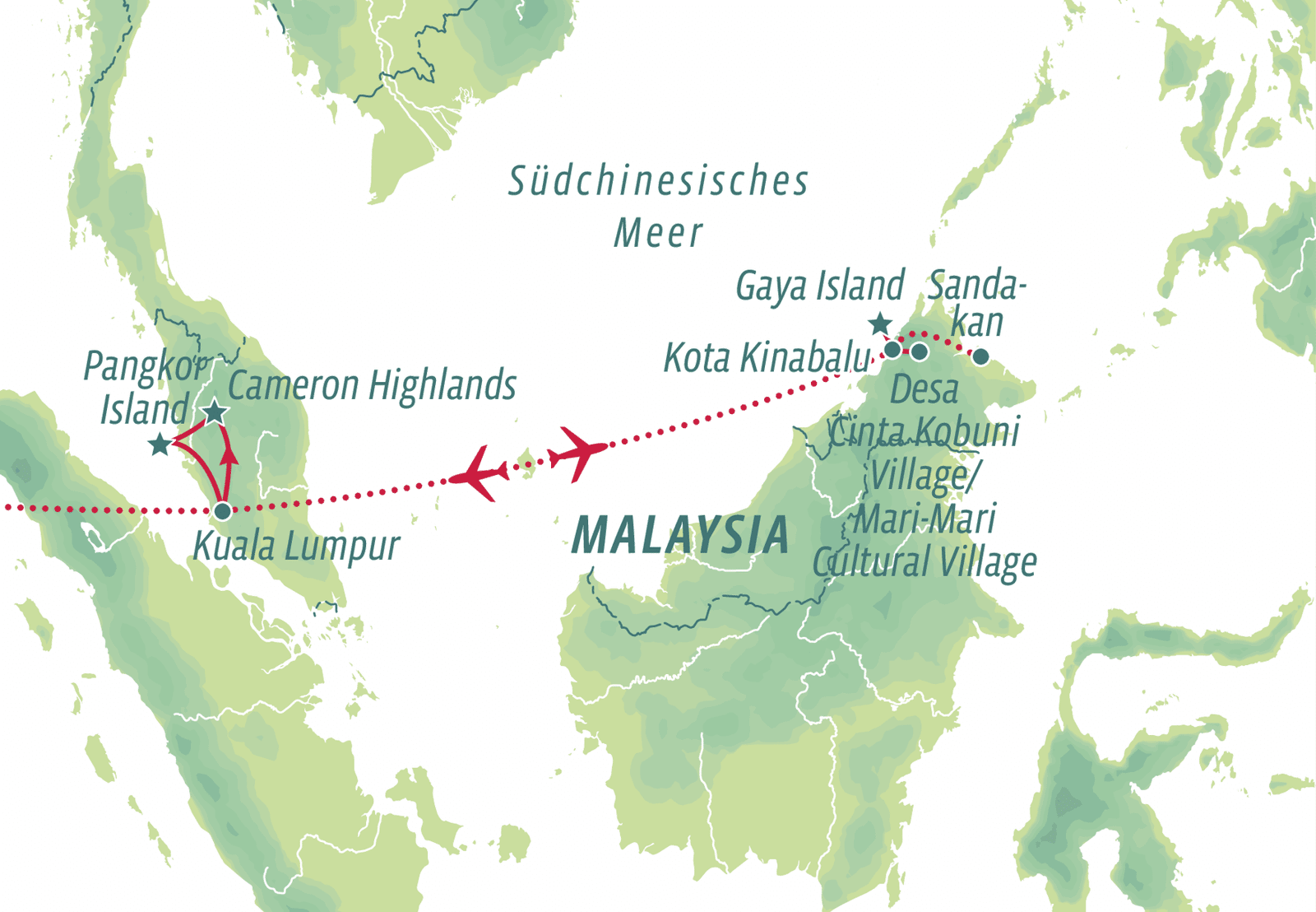 Erleben Sie das Beste Malaysias: von der modernen Hauptstadt Kuala Lumpur über die idyllischen Cameron Highlands und Pangkor Inseln bis hin zu den tropischen Wundern von Borneo. Entdecken Sie beeindruckende Natur, spannende Tierwelt und kulturelle Highlights – eine Reise voller Vielfalt und unvergesslicher Eindrücke.
