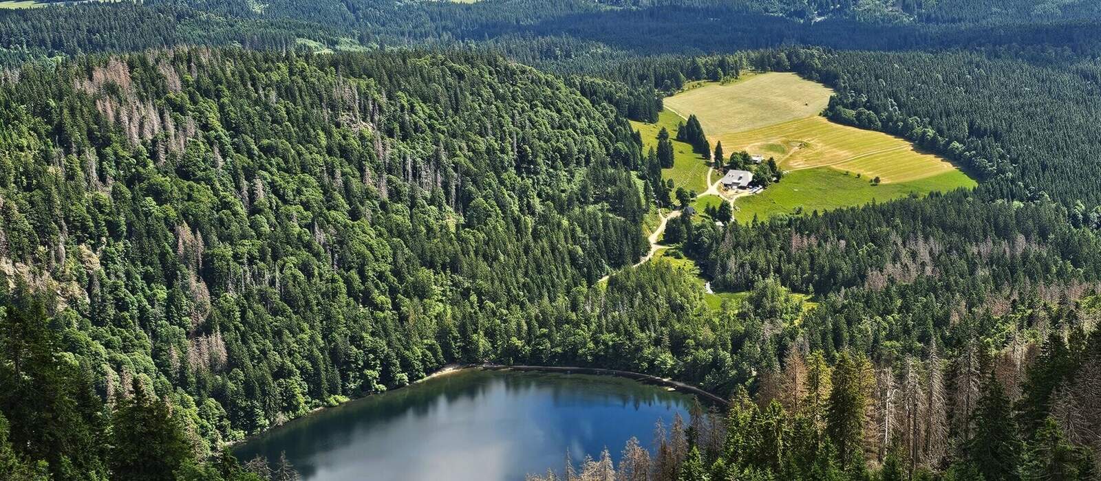 Am Ufer des Feldsees angekommen können wir unseren Blick über das mystisch dunkle Wasser schweifen lassen bis hoch an die Felskante zum Bismarkdenkmal am Seebuck am Feldberg. Zu beobachten gibt es auch zahlreiche Fischarten, Schmetterlinge und Libellen.