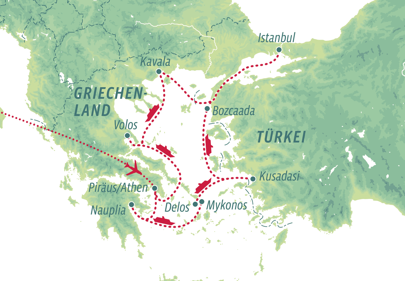 | Mi. | 14.10. | Abholdienst von Zuhause und Transfer zum Flughafen Findel. Flug nach Athen mit Zwischenstopp und Transfer zum Hafen Piräus. Einschiffung an Bord der Europa. | ||