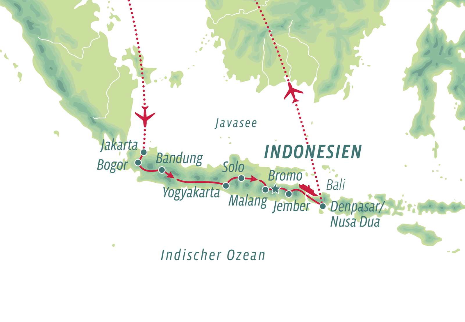 Erleben Sie die faszinierende Vielfalt Javas auf einer unvergesslichen Reise von der pulsierenden Metropole Jakarta bis zu den traumhaften Stränden Balis. Entdecken Sie in Bogor und Bandung koloniale Architektur und grüne Hochlandlandschaften, tauchen Sie in Yogyakarta und Solo in die kulturelle Seele Javas ein, und lassen Sie sich von den majestätischen Vulkanlandschaften rund um den Bromo verzaubern. In den Städten Malang, Jember und Banyuwangi erleben Sie authentisches indonesisches Leben abseits der bekannten Pfade. Den krönenden Abschluss bildet Nusa Dua mit seinen weißen Sandstränden und türkisblauem Wasser – ein perfekter Ort zum Entspannen nach einer eindrucksvollen Reise voller Kultur, Natur und Geschichte.