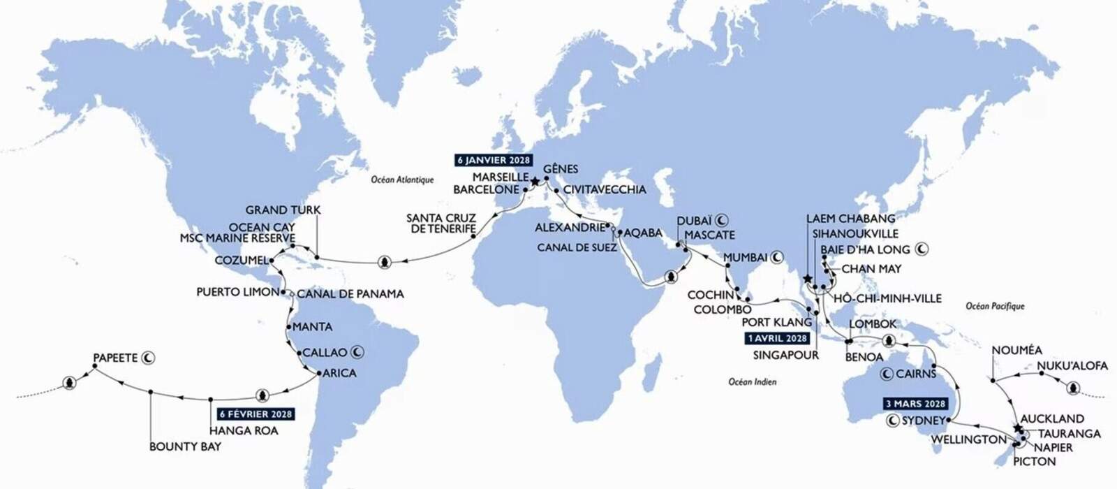 Ihre Weltkreuzfahrt 2028 beginnt in Spanien, wo Sie das mediterrane Kulturerbe entdecken können. Nach der Überquerung des Atlantiks machen Sie Ihren ersten Halt auf Teneriffa, gefolgt von Zwischenstopps in den türkisfarbenen Gewässern der Bahamas, Grand Turk, Cozumel und Puerto Limón in Costa Rica. Sie passieren den berühmten Panamakanal. Weiter geht es in den Südpazifik, wo Sie die geheimnisvolle Osterinsel, Tahiti und Neuseeland erkunden. Anschließend fahren Sie weiter nach Indonesien und Vietnam, dann in den Indischen Ozean und in den Nahen Osten mit Dubai.