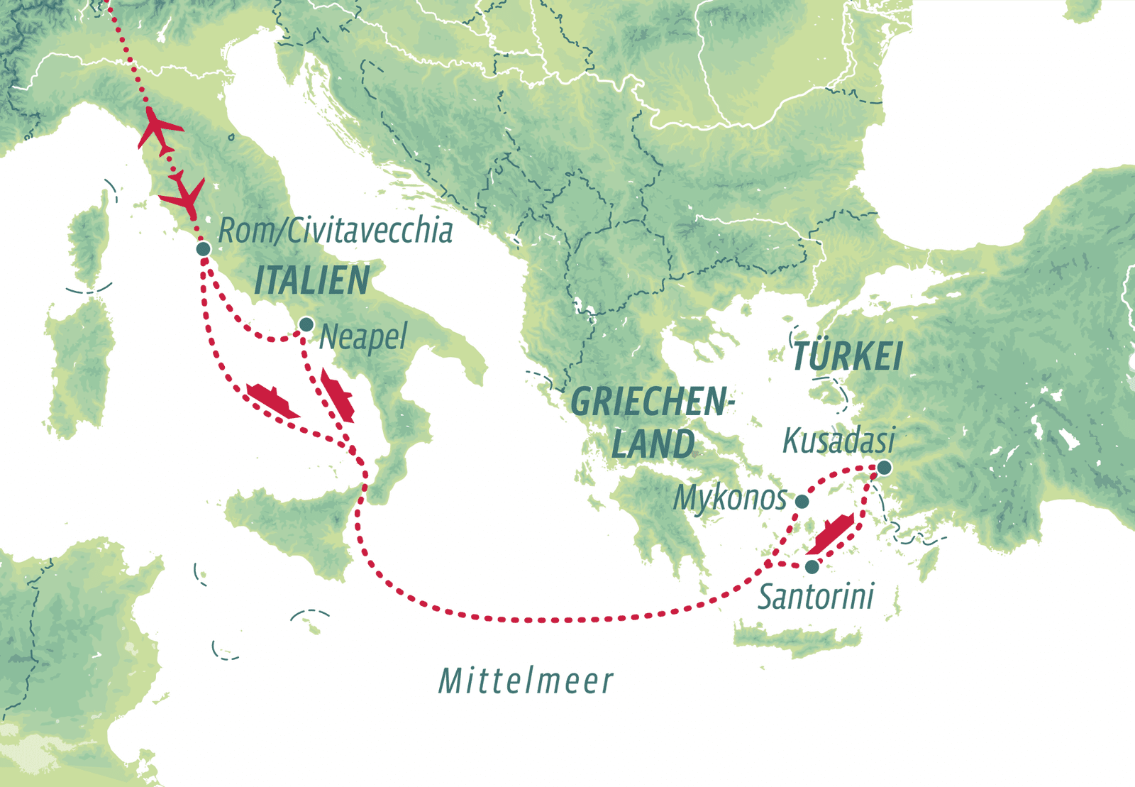 Von der glamourösen Insel Mykonos mit ihren weißen Häusern und windigen Gassen über Marmaris an der türkische Riveira bis hin zum geschichtsträchtigen Kuşadası an der türkischen Ägäisküste – jeder Hafen ist ein neues Abenteuer. Krönender Abschluss ist ein Besuch im lebendigen Neapel, dem Tor zur Amalfiküste und Heimat kulinarischer Genüsse.